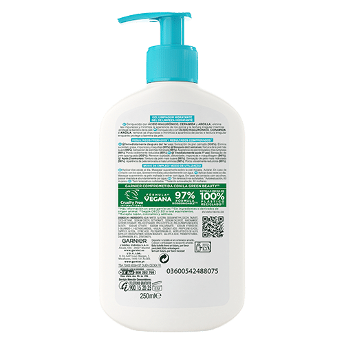 Garnier Pure Active Gel Limpiador Hidratante facial enriquecido con Ácido Hialurónico, Ceramida y Arcilla, elimina las impurezas y minimiza la apariencia de los poros y la textura irregular mientras protege la barrera de la piel